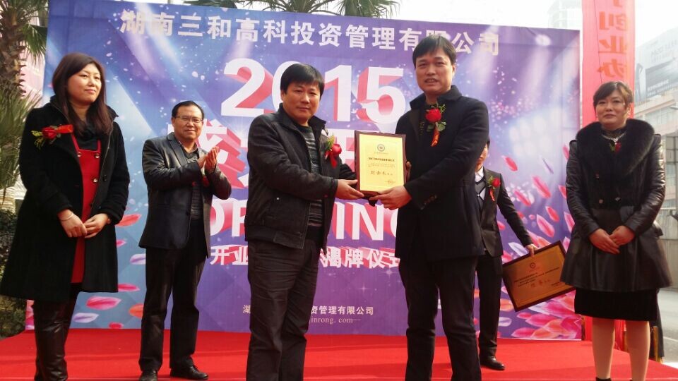 开业仪式中,黄安国、罗建新、陶陶分别代表湘高协、长高协、长职协分别为三和集团授予“湘高协理事单位”、“长高协副会长单位”、“长职协副会长单位”的牌匾。(本刊记者 贾晶晶)