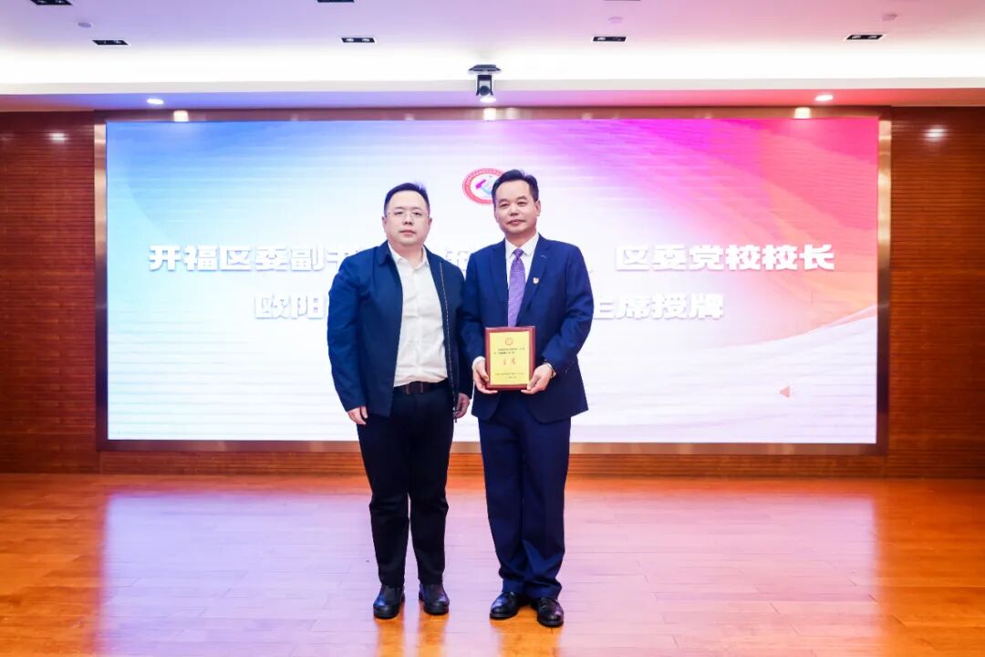 开福区委副书记、统战部部长、区委党校校长欧阳浩同志为新当选主席陈政峰授牌
